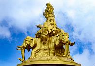 Le matin, montée en navette de la montagne (2 heures environ) et en téléférique jusqu'au sommet d'OR (3 077 m), où se trouve une magnifique statue de Puxian pusa (Samantabhadra) de 660 tonnes, atteint 48 m, entourée d'urnes comportant les cendres de prêtes bouddhistes. Visite du temple Huazang, le symbole de la réunion de ces deux branches du bouddhisme en Chine. Puis, visite du temple des dix mille années (Wannian Si) le plus ancien temple du Mont Emei, conservé une statue en bronze mesure 7,35 mètres de haut, son poids est de 62,1 tonnes. Descente au pied de la montagne en téléférique profitant le paysage magnifique. Ensuite, visite du temple de la Proclamation Du Royaume (baoguo si), exposé de bouddha en porcelaine, de statue de lion trône, c'est un temple commun au confucianisme, au taoïsme et au bouddhisme.